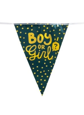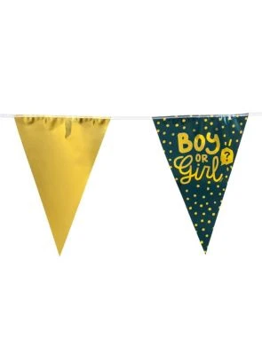 – Wimpelkette mit je zwei unterschiedlichen Wimpeln: rein goldfarbene und grüne mit dem Aufdruck „Boy or Girl?“