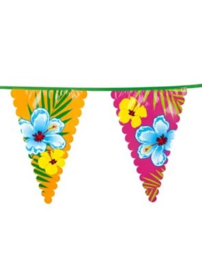 Tropisch bunte Hawaii-Wimpelkette, mit Hibiskusblüten, 6 m lang, exotische Feierstimmung garantiert!In tropisch bunten Farben, mit fröhlichen Hibiskusblumen, schlängelt sich diese Wimpelkette auf stolzen 6 m Länge. Die einzelnen Wimpel sind ca. 45 cm lang und an einer grünen Plastik-Kordel festgenäht. So verbreitet Ihr exotische Feierstimmung im Nu. Aloha!